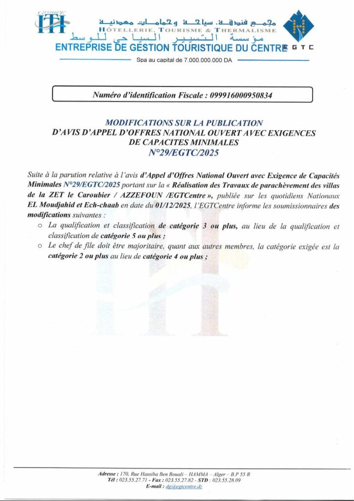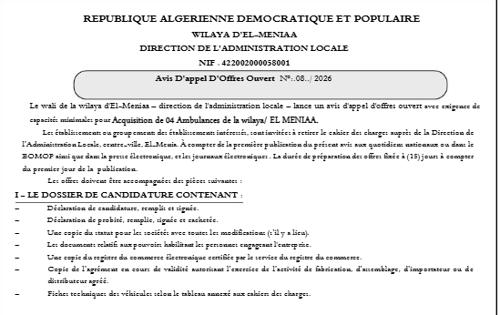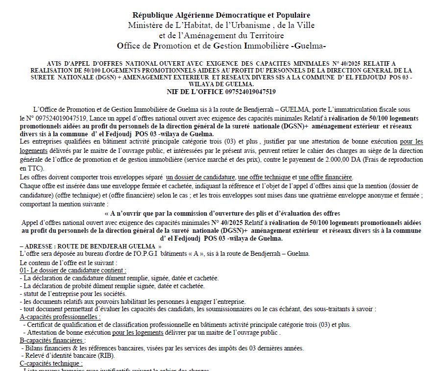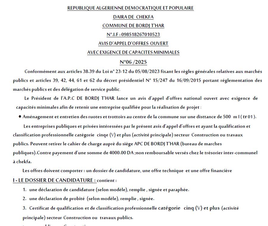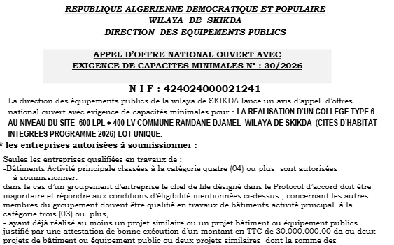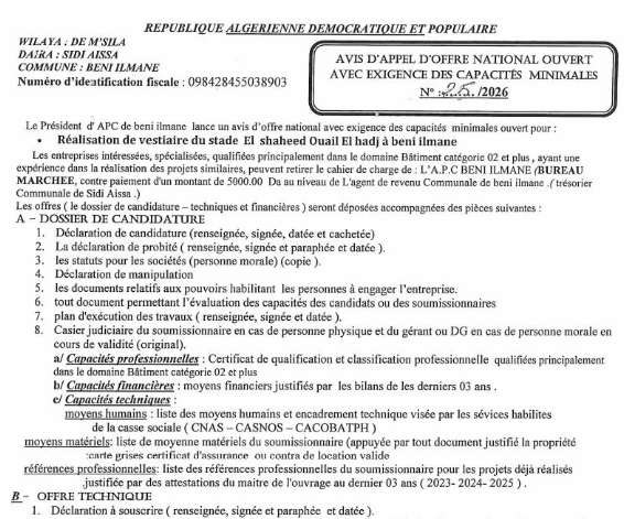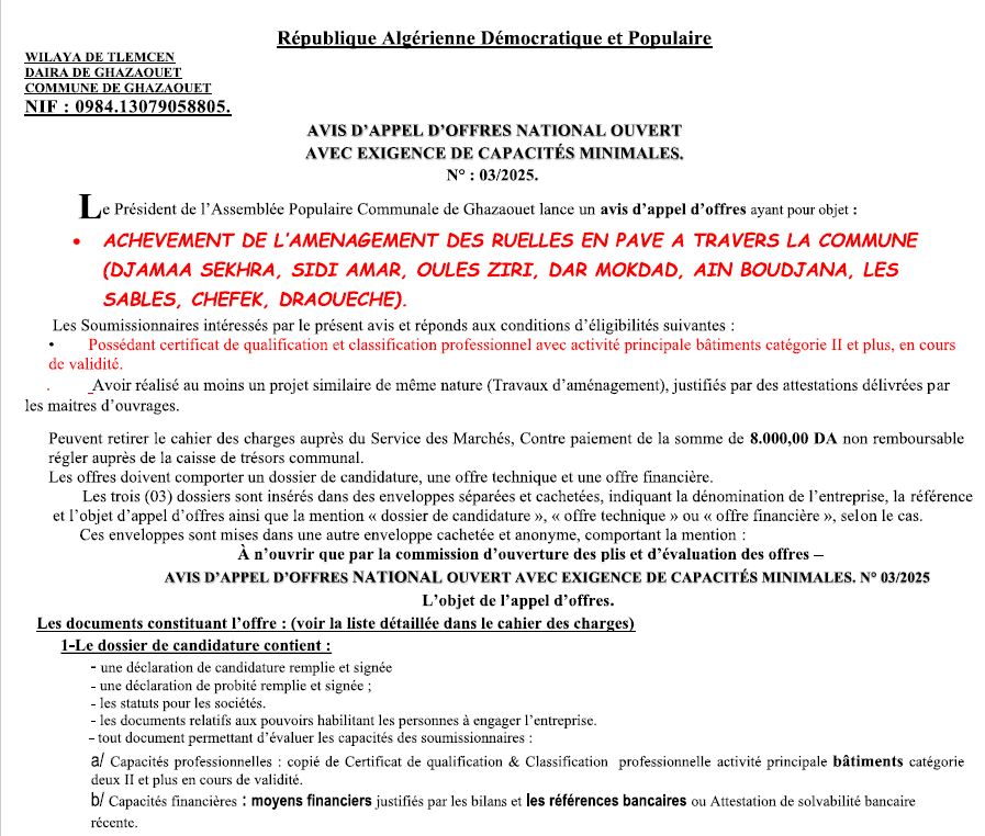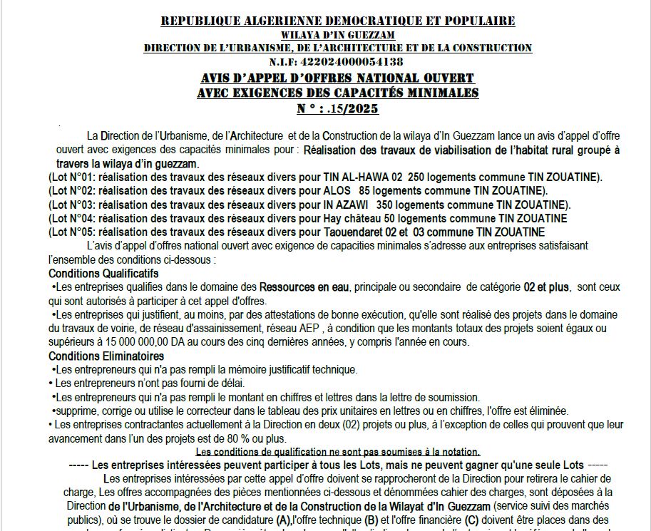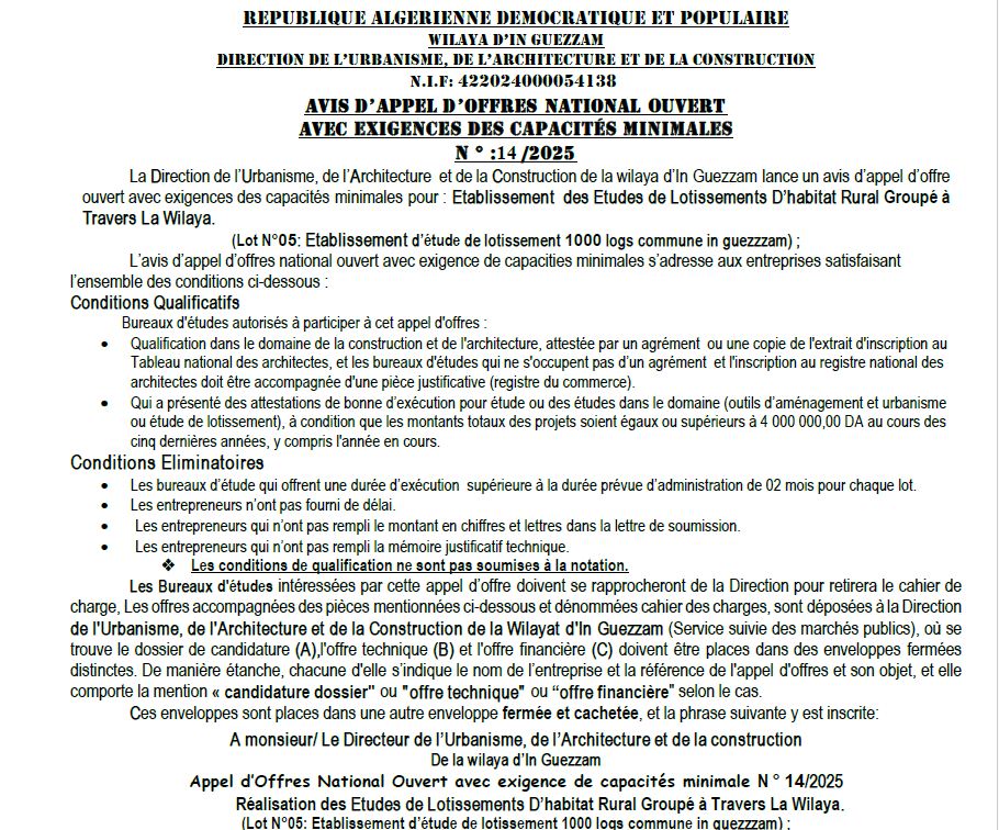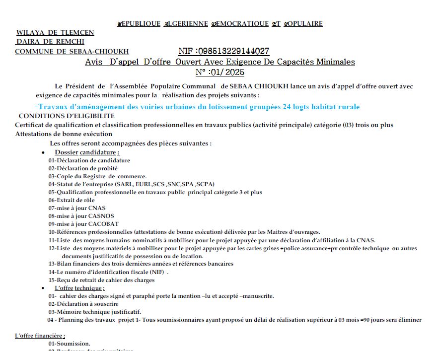 Objet : Avis d'Appel d'Offres National Ouvert avec Exigence de Capacités Minimales