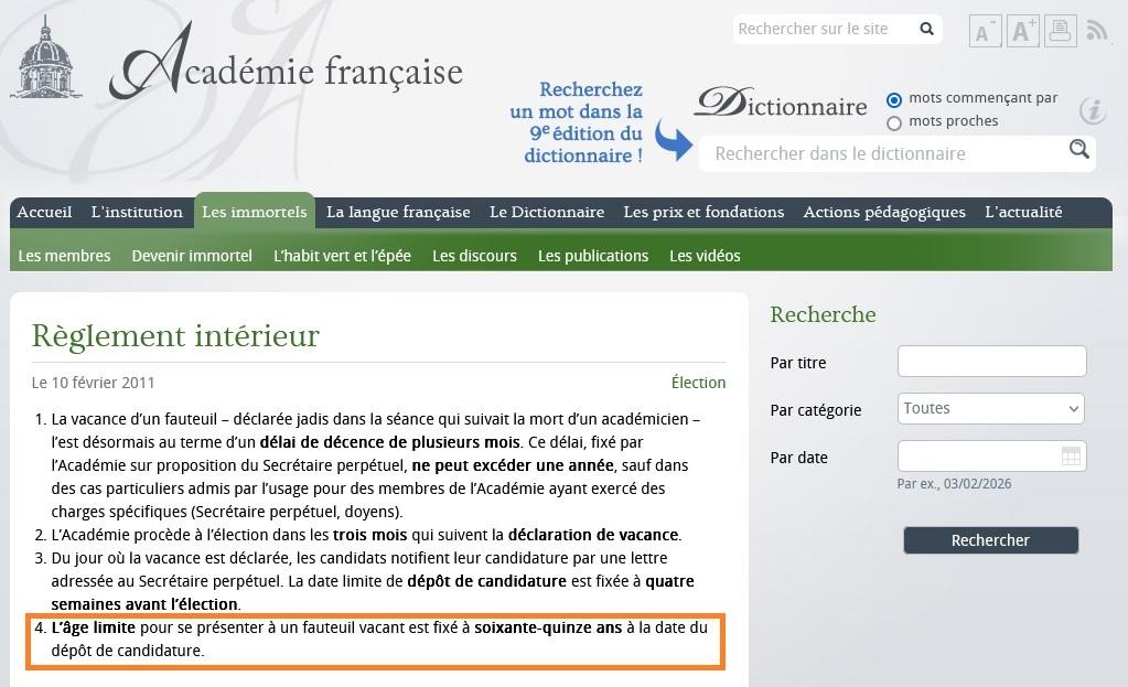 En dépit de ce rajeunissement de ce néo-Charles Maurras, l’Académie royale française a violé son propre règlement intérieur (publié le 10 février 2011), en recrutant cet imposteur néo indigène, puisque l’article 4 stipule : « L’âge limite pour se présenter à un fauteuil vacant est fixé à soixante-quinze ans à la date du dépôt de candidature ». Sa candidature à l’Académie française, rédigée par le système, n’était donc pas recevable, puisqu’elle ne satisfait pas ce critère qui évite le mouroir immortel de la fabrication politique devenue littéraire.