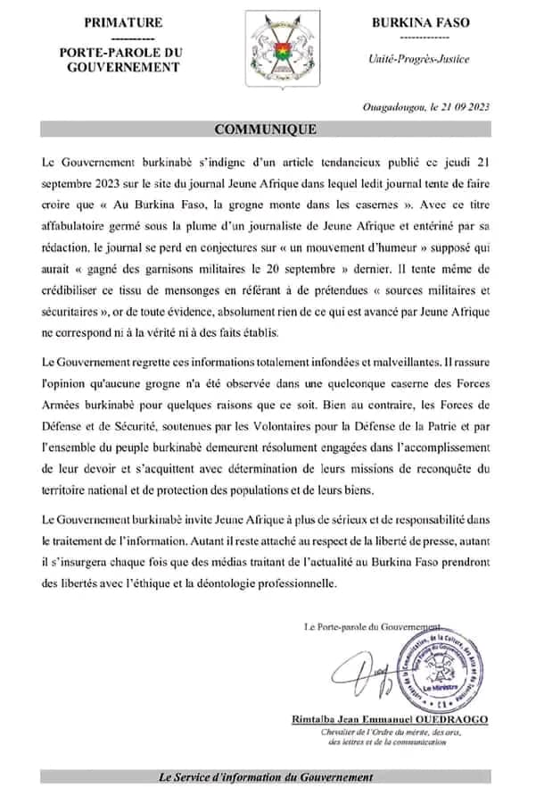 Dans un communiqué rendu public, le gouvernement burkinabé s’est indigné de la publication ce jeudi 21 septembre, d’un article sur les colonnes du média français Jeune Afrique intitulé” Au Burkina Faso,la grogne monte dans les casernes”.