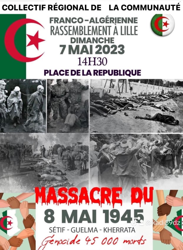 A l’occasion de la commémoration du 78 ème anniversaire des massacres de Sétif, Guelma et Kherrata du 8 mai 1945 perpétrés par l’occupant français,le collectif régional de la Communauté franco-algérienne organise ce dimanche 7 mai à la place de la république à Lille à partir de 14H30 un rassemblement visant à exprimer leur indignation à l’égard de ce déni d’injustice, commis par la France qui se revendique être une nation de liberté.