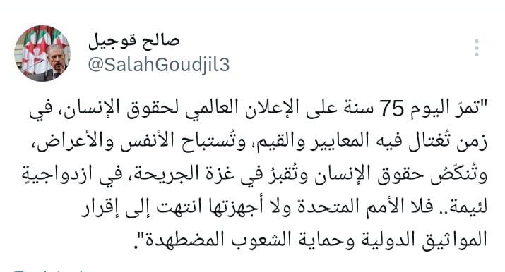 “Il y a 75 ans, fut proclamée la Déclaration universelle des droits de l’Homme, dont nous célébrons aujourd’hui l’anniversaire alors que les normes et les valeurs humaines sont assassinées, au même titre que les vies et au moment où les droits de l’Homme sont bafoués et enterrés à Ghaza, ville meurtrie, au vu et au su de l’ONU qui peine, elle et ses institutions, à faire respecter les chartes internationales et imposer le respect des peuples opprimés”, a écrit M. Goudjil dans une publication sur les réseaux sociaux.