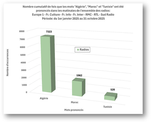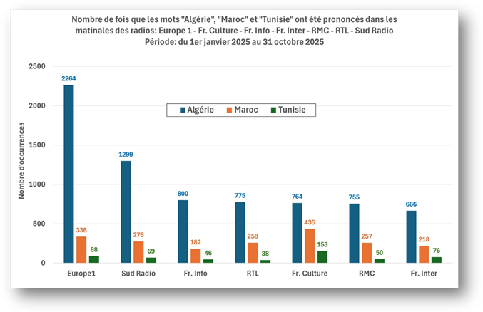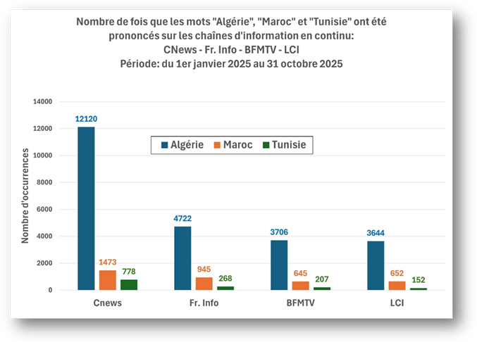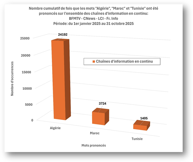Autre constatation édifiante : puisque l’étude s’étend du 1er janvier au 31 octobre 2025, c’est-à-dire durant 304 jours, le mot « Algérie » a été cité, en moyenne, pas moins de 80 fois par jour par les quatre chaînes d’information en continu! En comparaison, ces moyennes sont de 12 pour le Maroc et de moins de 5 pour la Tunisie.