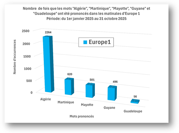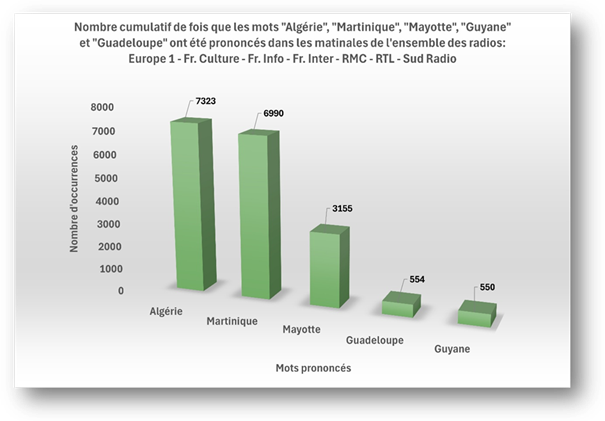 D’un autre côté, cette indifférence médiatique française à l’égard des DROM montre le peu de d’intérêt que portent les autorités françaises au sort de ces contrées d’outre-mer. Et ces chiffres sont d’autant plus choquants dans le cas de Mayotte, île qui a été très sévèrement dévastée par le cyclone Chido, le 14 décembre 2024. Notre étude qui a débuté le 1er janvier 2025, à peine 2 semaines plus tard, et qui s’achève le 31 octobre 2025, n’a enregistré que 10 552 citations pendant cette période (télévisions + radios), c’est-à-dire près de 21 000 de moins que l’Algérie!