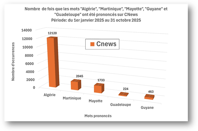 4- Pire encore, l’Algérie est plus citée durant cette période que les « Départements et régions d’outre-mer » (DROM) français: Guadeloupe, Guyane, Martinique, Mayotte. La palme revient à CNews qui a cité l’Algérie 54 fois plus que la Guadeloupe;