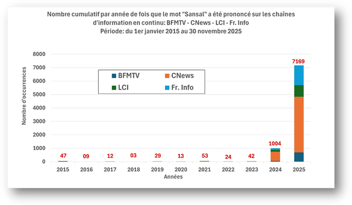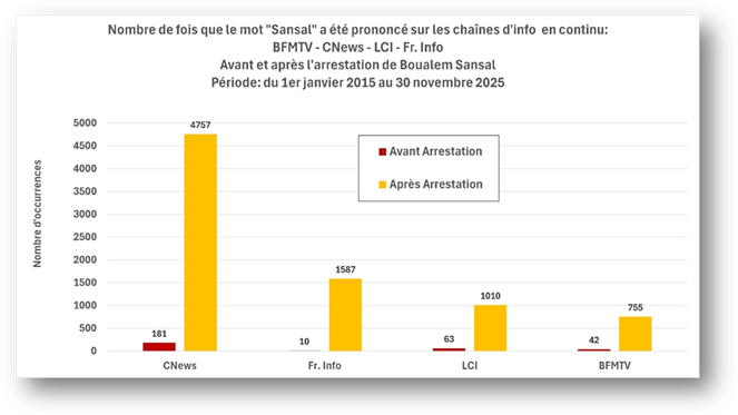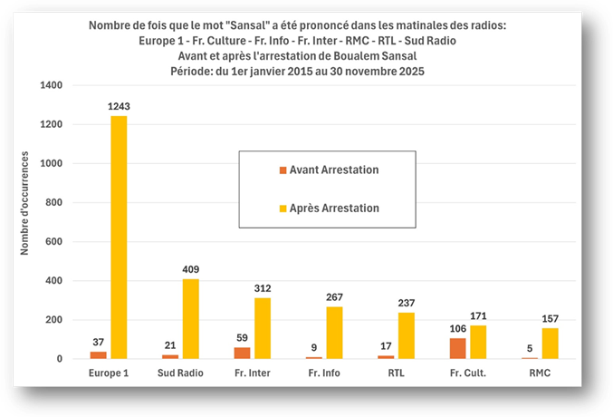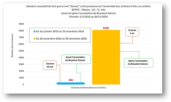 Finalement, si on tient compte de tous les médias utilisés dans ce travail (chaînes d’information en continu et radios), le nom de Sansal aura été prononcé 10905 fois durant les onze premiers mois de 2025 contre 550 fois les dix années précédentes!