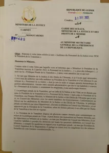 Extrait du courrier de l’ex-ministre de la Justice : « Comme suite à votre lettre par laquelle vous m’informez que Monsieur le Président de La transition recevra, le 2 janvier 2022, le Personnel de la Justice (…) pour des échanges (…) axés sur la Politique Pénale de la transition. J’attire votre attention sur ce qui suit :