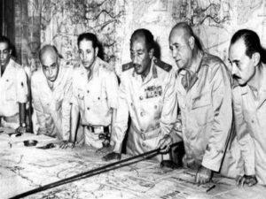 Le soir du 6 octobre, 60.000[4] soldats égyptiens ont traversé le Canal (Opération Badr). Le 7 octobre, la Ligne Bar Lev n’existe plus. L’entité sioniste est en déroute. Le mythe de l’invincibilité d’Israël est ébranlé. Les responsables sionistes s’accusent mutuellement de cette catastrophe. Golda Meir[5] aurait même envisagé le recours à l’arme atomique.