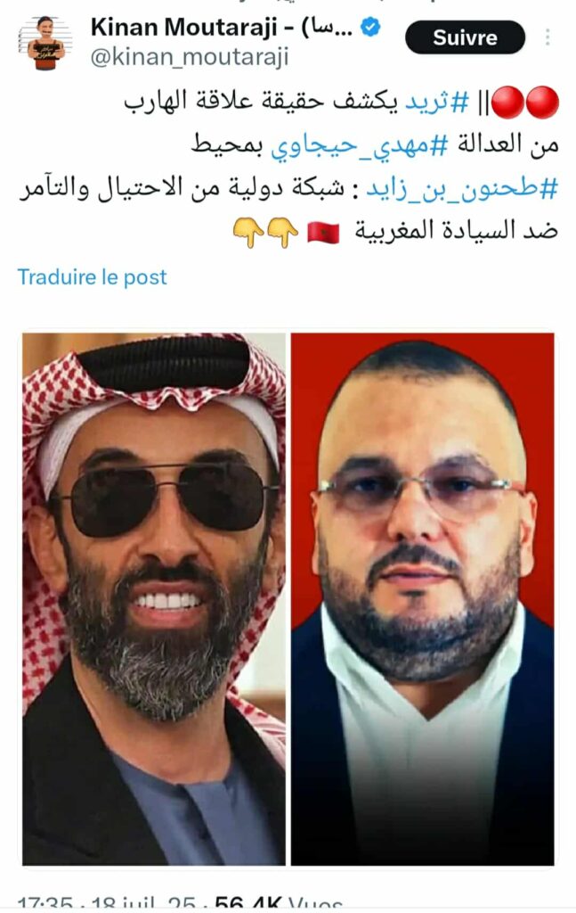 Les instruments de la propagande makhzenienne,n’ont pas tardé à accuser ouvertement Tahnoun ben Zayed Al Nahyane TBZ, d’être l’instigateur de cette guerre interne opposant les différents services du renseignements marocains et d’être le protecteur de Mehdi Hijaoui dont le récent livre( livre blanc sur le renseignement, la sécurité et la défense nationale” avait été préfacé par l’agent-journaliste de la DGSE française Claude Moniquet.