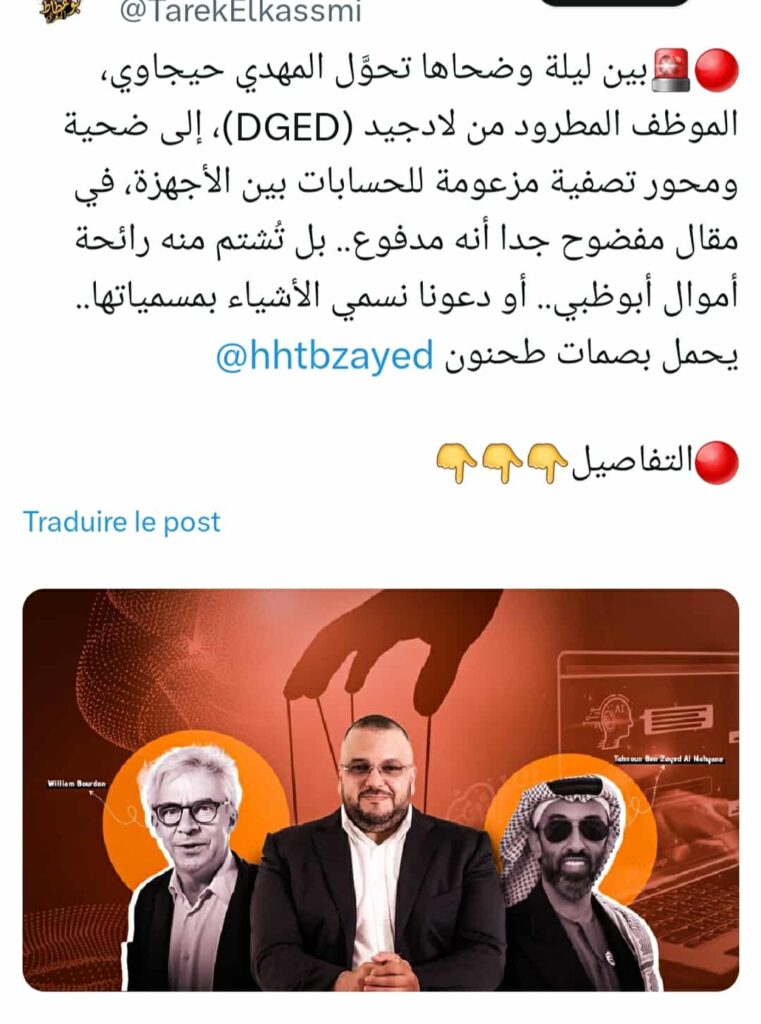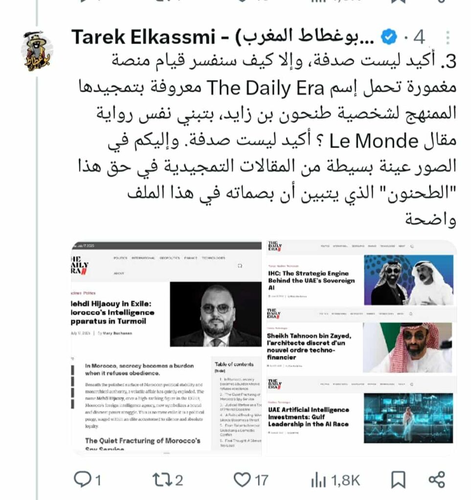 Les nouveaux développements ont été bien illustrés par le dernier article du journal français Le Monde,connu pour être inféodé et une tribune de la DGSE et du Quai d’Orsay, et les attaques des instruments de la propagande makhzenienne visant le frère du président émirati accusé d’être le financier et le premier soutien de l’ancien numéro deux de la DGED Mehdi Hijaoui. Ce dernier développement dans les relations entre Rabat et Abou Dhabi pourrait expliquer cette annonce-info du site Hespress de la mort de Mohamed VI, retirée rapidement, sachant que ce site de la propagande makhzenienne est financé par les émiratis. Une annonce qui survenait après un séjour privé de Mohamed VI aux EAU.