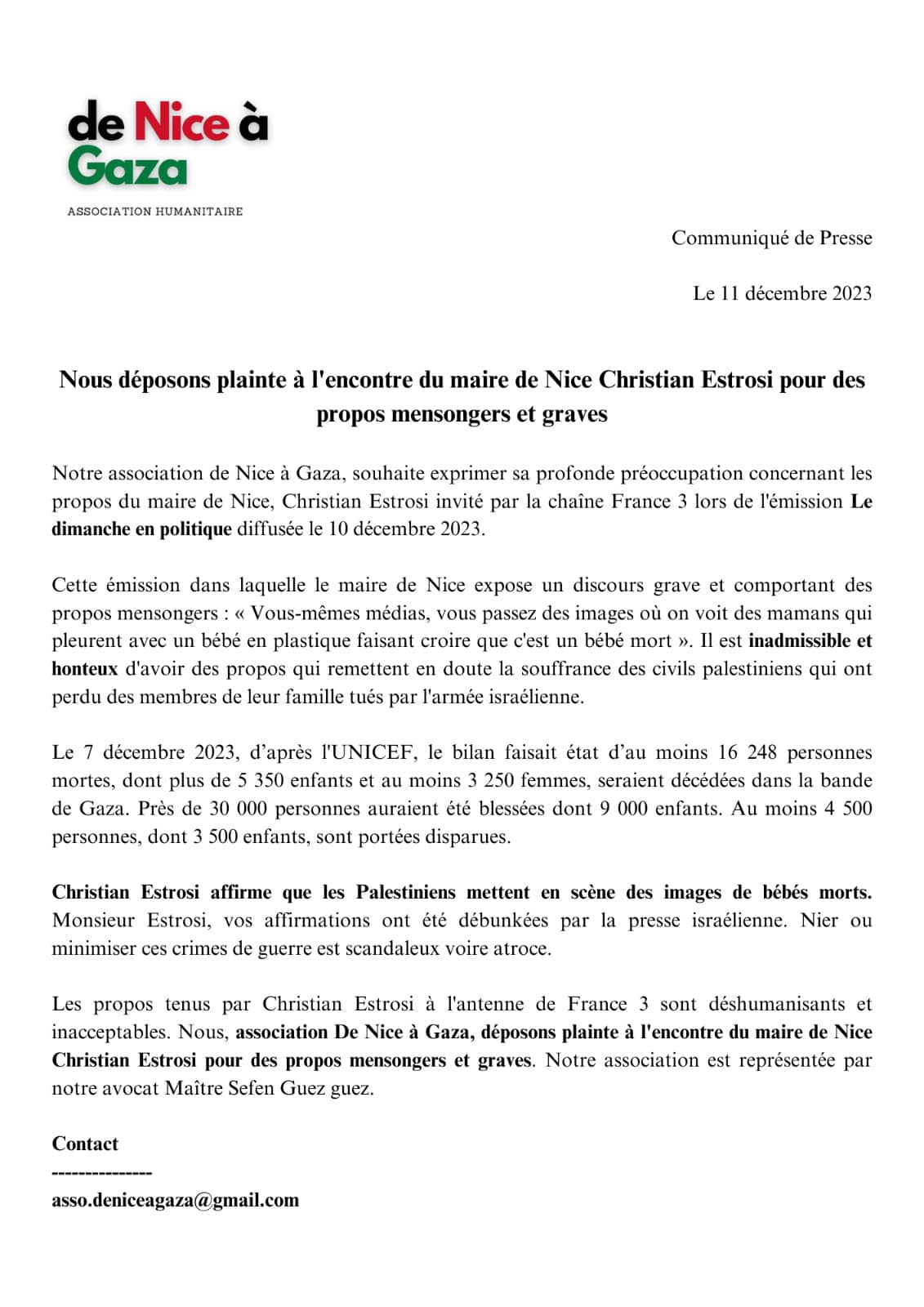 L’association Nice à Gaza annonce ce lundi 11 décembre avoir déposé une plainte contre le maire de Nice Christian Estrosi suite à son intervention télévisée sur France 3, du dimanche 10 décembre marquée par des propos honteux à l’égard des victimes palestiniennes du génocide sioniste.