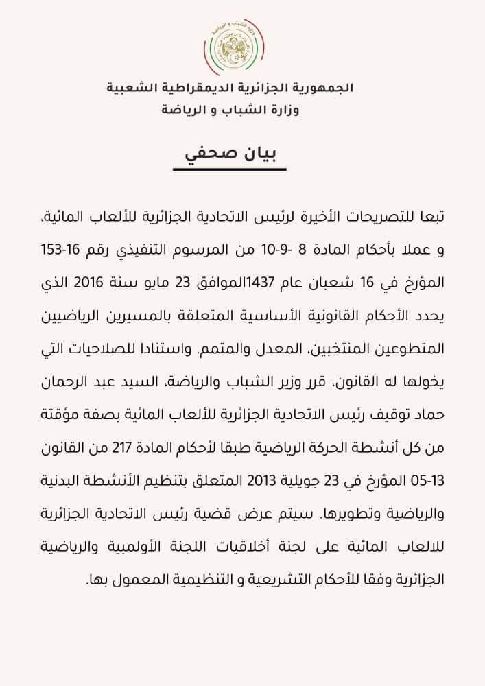 « Suite aux récentes déclarations du président de la fédération algérienne de natation (FAN), le ministre de la Jeunesse et des Sport, Abderrahmane Hammad, a décidé de suspendre provisoirement le président de la FAN de toute activité en lien avec le sport » indiquait le communiqué du MJS.